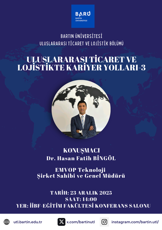 23 Aralık 2025 saat 14:00'da İİBF&Eğitim Fakültesi Konferans Salonu'nda, EMVOP Teknoloji Kurucusu ve Genel Müdürü Dr. Hasan Fatih BİNGÖL konuşmacılığında Uluslararası Ticaret ve Lojistikte Kariyer Yolları isimli etkinlik serimizin üçüncüsü düzenlenecektir. Tüm öğrencilerimizin katılımını bekliyoruz.